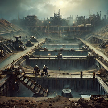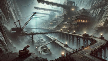 Description: A dystopian industrial wasteland with towering factories, forced labor camps, and a polluted, crimson-hazed sky.